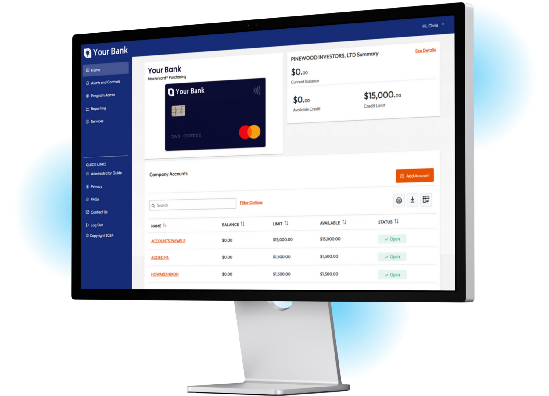 The admin interface supports role-based administration and company hierarchies. Business admins can issue physical, virtual, and ghost cards, turn cards on/off, set credit limits, set spend controls, receive alerts, manage expense reporting, and access customizable reports.